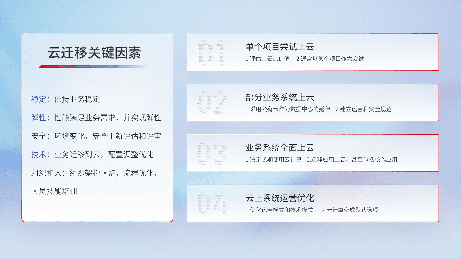 结合实际业务,,,,从规划设计、、云平台选型、、云原生改造、、、数据迁移、、、集成交付,,,迁移全过程为客户识别最佳上云路径,,做好风险识别管理,,,设计网络架构、、、身份权限、、、安全审计合规、、操作审计、、日志审计、、监控告警策略、、、多站点容灾设计等,,,对云上基础设施进行整体规划,,,提升IT治理水平,,以满足弹性、、高可用、、高性能的需求。。。。